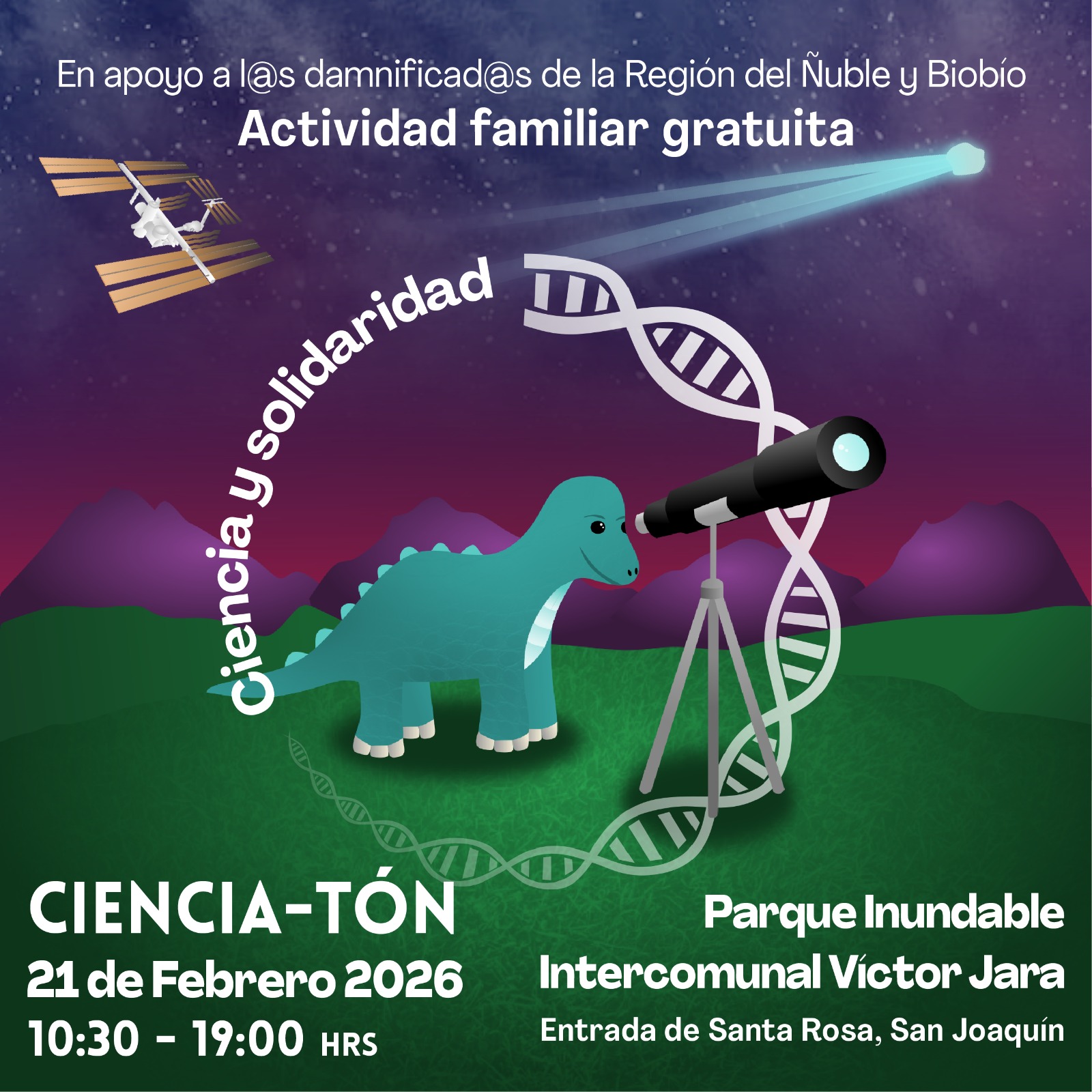 Con el objetivo de apoyar a los niños y niñas afectados por los incendios en las Regiones del Biobío y Ñuble, este sábado 21 de febrero de 2026 se realizará la CienciaTón 2026 , una gran feria gratuita de divulgación científica en el Parque Inundable Víctor Jara de San Joaquín en Santiago.