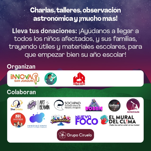 El evento, el cual puedes encontrar más información en su perfil de Instagram (cienciaton2026), es posible gracias al trabajo voluntario de una red de divulgadores e instituciones, que incluye a figuras como la divulgadora Valeska Romina Beamín (art_beamin), la Escuela de Astronautas MARTEENS, la Sociedad Chilena de Paleoarte y Divulgación Paleontologíca (SOCHPAD), Andes Aerospace, con el apoyo de la Agrupación de Mujeres Líderes Mundiales G100 y la Ilustre Municipalidad de San Joaquín.