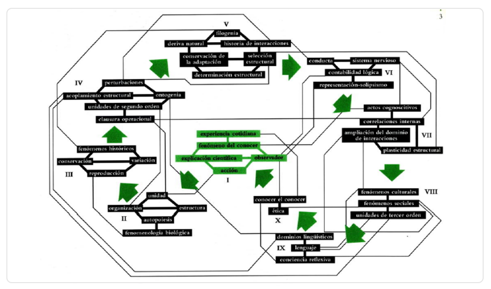 Allí fundamenta el conocimiento como una actividad biológica mediante un complejo entramado conceptual que va trabajando (Imagen 1). Maturana argumenta que todos los seres vivos son observadores, y como tales, conocedores de su ambiente, es decir, que el vivir es conocer en el ámbito de existir, aforísticamente: vivir es conocer.