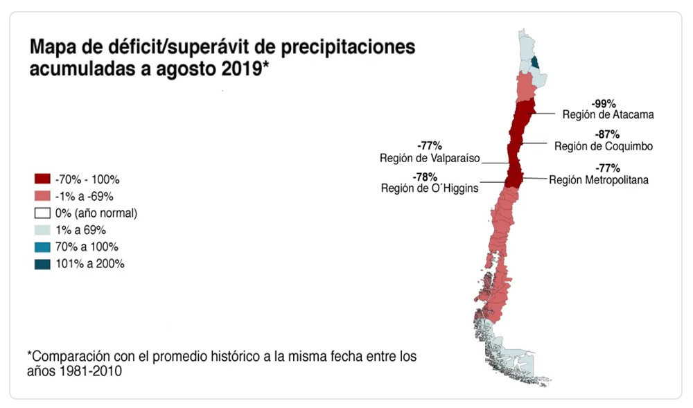 Desde hace más de diez años hemos estado enfrentando una mega sequía a lo largo del territorio. Esto se puede observar en el siguiente mapa, en donde se muestra el déficit de precipitaciones acumuladas del territorio en agosto 2019 comparado con el promedio histórico a la misma fecha entre 1981-2010: