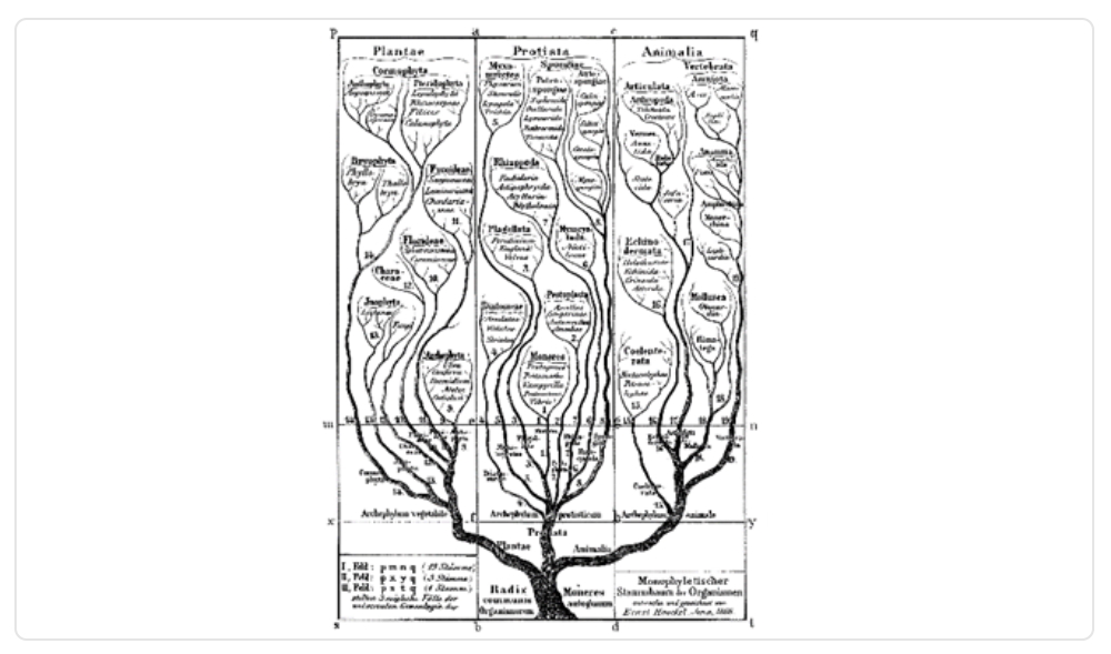 Años después, en 1866, Ernest Haeckel propuso árboles de variados grupos de seres vivos. Su árbol de la vida más conocido fue publicado en su libro Morfología General de los Organismos, donde propuso la clasificación de la biota en tres reinos, ampliando la propuesta de Linneo -fundador de la taxonomía- del reino animal y vegetal, agregando los protistas, los cuales son organismos unicelulares y pluricelulares muy básicos.