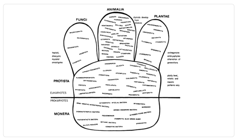 Con el paso del tiempo, la científica Lynn Margulis, reconocida por su Teoría de la Endosimbiosis Seriada, en 1971 hizo una crítica al árbol de Whittaker y en 1974 propuso su propio árbol con cinco reinos, pero con la categoría adicional de los super reinos: eukaryota y prokariota. Posteriormente, ambos científicos trabajaron en conjunto para mejorar sus propuestas, las cuales fueron presentadas en un artículo en 1978, que no incluía el árbol filogenético.