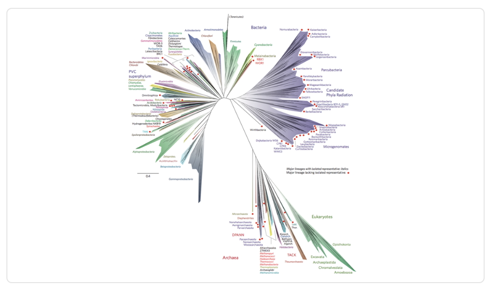 En base a esto, la científica Laura Hug y su equipo propusieron un nuevo árbol de la vida en el 2016. Basado en las similitudes del RNA 16s ribosomal, nos entrega una forma más certera de representar las relaciones de parentesco entre especies, la cual se puede apreciar en la figura a continuación: