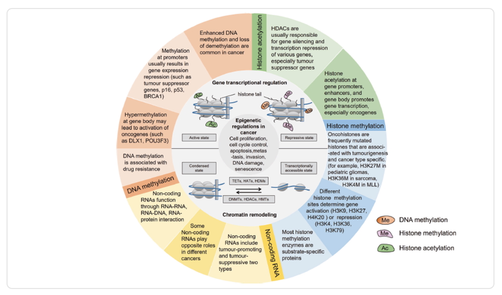 Imagen 1. Regulación Epigenética en cáncer. Las alteraciones Epigenética en el cáncer regulan diversas respuestas celulares, incluyendo la proliferación, apoptosis, invasión y senescencia. Esto se regula a través de la metilación del ADN, la modificación de histonas, la remodelación de la cromatina y la regulación de ARN no codificante evidenciando que la Epigenética juega un rol importante en la génesis de un tumor cancerígeno.